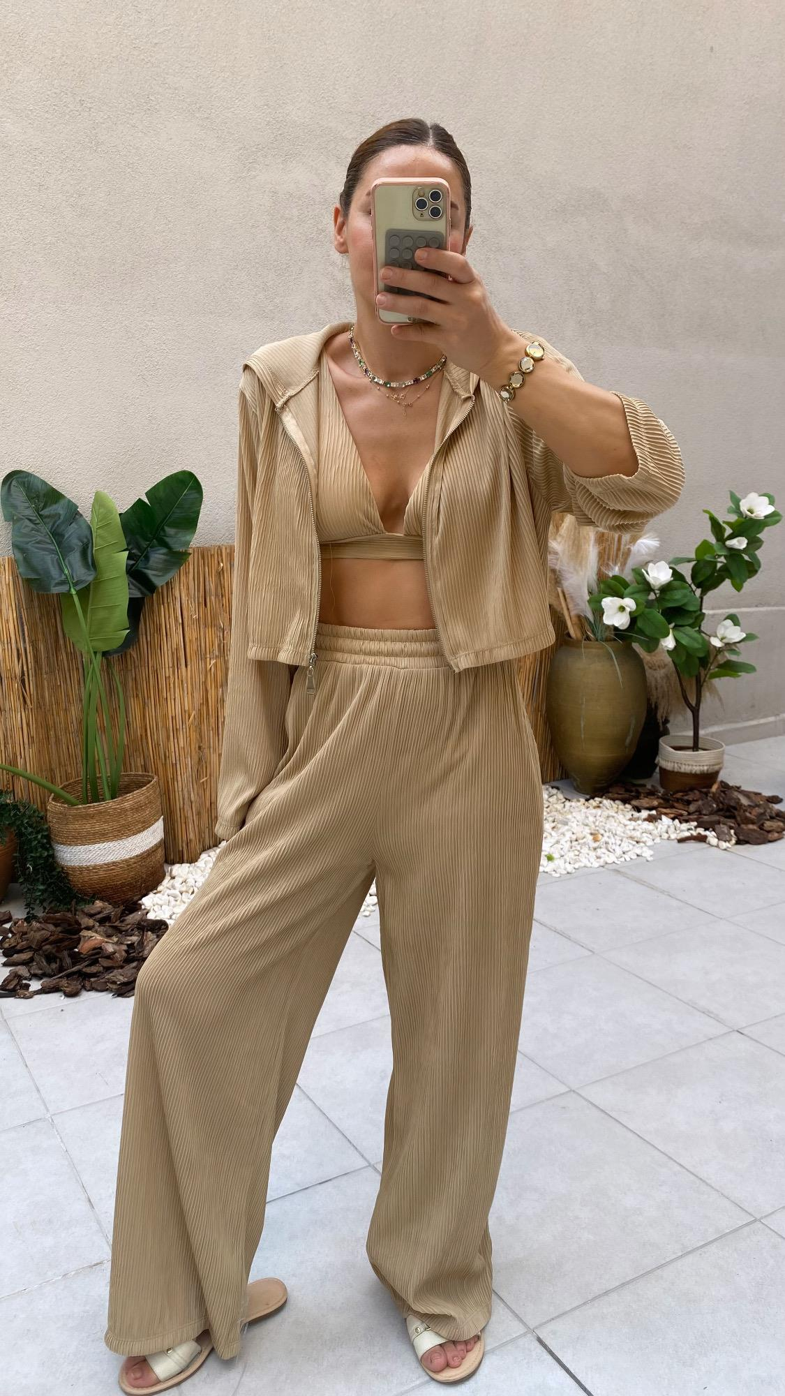 YENİ SEZONKrem Bustiyerli Krinkıl Croplu Üçlü Takım